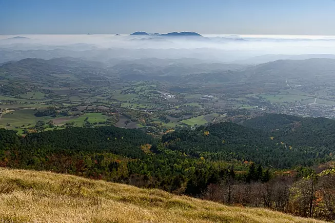 Seguendo il crinale, ci troviamo a 1.194 metri, sulla cima di Monte Palazzolo. La vista sulla Valmarecchia si apre come un portale su un nuovo mondo mai visto. A questo punto, iniziamo a scendere. Eccoci a 1.036 metri di quota accanto a una vecchia celletta dedicata alla Madonna. Seguiamo sempre la strada sterrata, ossia il sentiero CAI 105, e continuiamo sino all’Eremo della Madonna del Faggio. Il Bosco di Pianacquadio ci attende ed è sempre più dietro l’angolo. Andiamo a destra, salendo nel bosco intenso e incrociando il sentiero CAI 102A.