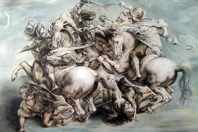 Nel 1440 si disputò una delle battaglie più sanguinose, veloci e violente della storia: la battaglia di Anghiari. La guerra era tra milanesi e fiorentini; i fiorentini vinsero in meno di 24 ore e, dal giorno alla notte, il Ducato di Milano subì la sua ferita più profonda. Una delle ragioni per le quali abbiamo molte informazioni su tale avvenimento è il celeberrimo dipinto di Leonardo da Vinci, realizzato su una delle pareti del Salone dei Cinquecento di Palazzo Vecchio. L’opera, purtroppo, non è rimasta integra e oggi non ci sono tracce della pittura. Sappiamo, però, che Leonardo non portò mai a compimento totale la sua opera, a causa di un problema nell’intonaco.