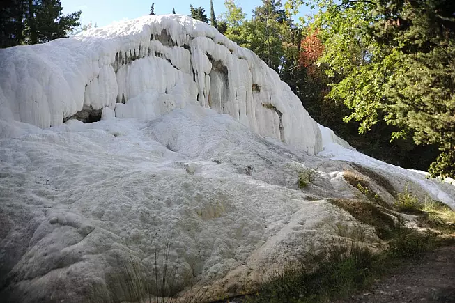 Le formazioni calcaree di Bagni San Filippo hanno ricoperto le rocce di uno strato bianco molto acceso. Quando si entra nel centro termale, si percorre a piedi una sterrata per raggiungere la zona libera. Lo scenario è di elevato spessore: le rocce bianche sono dovute all’accumulo di concrezioni di carbonato di calcio da parte delle acque sulfuree.