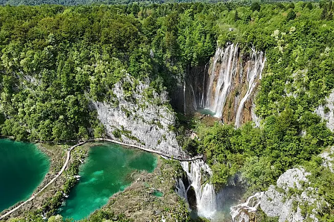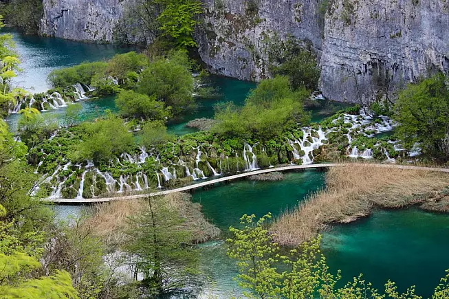 Il parco si può ammirare grazie a una serie di 18 chilometri di sentieri con passerelle di legno, che danno proprio la sensazione di camminare sull’acqua. In questo modo, si possono attraversare le due aree del parco: quella superiore, in cui prevale la roccia dolomitica, con i 12 laghi più grandi e cascate mozzafiato in una verdeggiante cornice di boschi fitti, e quella inferiore, dove i bacini lacustri sono un po’ più piccoli e la vegetazione è meno imponente.