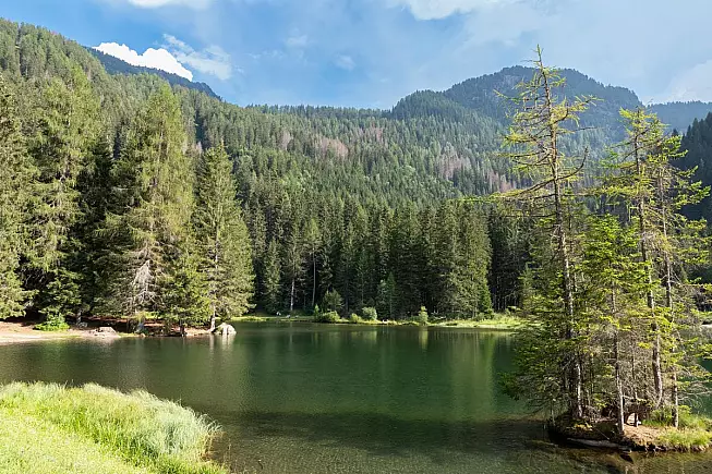 Dopo aver parcheggiato, si prosegue su strada asfaltata in salita così da arrivare in vista dell’emissario del lago, formato da uno scivolo rombante che crea una impetuosa rapida. Lo si affianca tenendolo alla propria destra, arrivando sulle rive verdeggianti (1.320 metri). Da qui, si tiene la sinistra, così da percorrere, lungo la strada bianca, il periplo del bel bacino, circondato da fitti abeti e con diverse invitanti panchine (fontane).