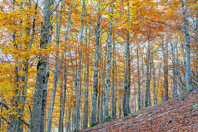 Tra sentieri montani, strade sterrate, vedute e laghi artificiali, il percorso cambia continuamente volto, regalandoci una varietà di panorami che saprà stupirci e incantarci. Il foliage della faggeta ci farà camminare con il naso all’insù, seguendo i giochi di luce dei raggi di sole che filtrano tra le foglie, illuminando il bosco con tonalità caldissime.