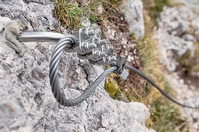 Iniziamo la nostra sfida e arrampichiamoci su una placca verticale, appigliandoci abbastanza comodamente. Una volta superato questo punto, ci ritroviamo di fronte a uno spigolo molto esposto, che ci farà salire. Procediamo con attenzione sul fianco sinistro della cresta, tenendoci con un cordino d’acciaio che, tuttavia, non è sempre completamente teso. Scendiamo per trovarci di fronte a una forcella, oltre la quale dobbiamo percorrere una breve cengia. Seguiamo la cresta e usiamo un pilastro sul sentiero come appiglio per continuare in sicurezza il percorso.