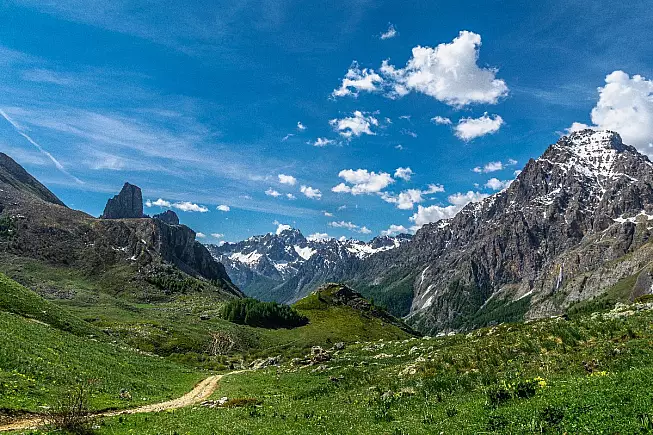 Dai 2.942 metri della cima del Monte Bellino proseguiamo per il Colle Traversiera e poi verso il Colle della Val Fissela, che ci regala una vista incredibile non solo sulle vette della Valle Maira, ma anche sulla Valle Varaita e sul Monviso. Il nostro itinerario prosegue per il Passo di Lauset, dal quale raggiungiamo in poco tempo alcune antiche fortificazioni e casermette che spezzano la linearità del paesaggio con i loro muri in pietra e le storiche porte in ferro.