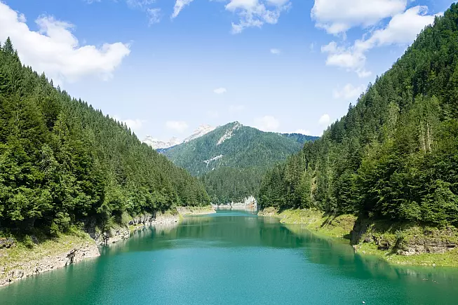 Da qui ci si dirige nuovamente verso la Diga di Noana, completando il nostro giro ad anello che si immerge nei boschi e nella natura incontaminata e selvaggia di questa valle. La diga si trova perfettamente inserita nell’ambiente naturale e offre diversi punti panoramici sui quali possiamo ancora soffermarci sia sul lago che sulla valle sottostante